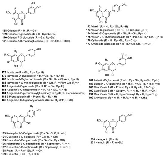 Thirty-four flavonoids were isolated from C. sativa (168–201), which could be categorized into seven basic chemical skeletons that can be methylated, glycosylated (C or O glycosides), prenylated, or geranylated (Figure 13). The seven chemical structures of the flavonoid aglycones are orientin, vitexin, isovitexin, apigenin, luteolin, kaempferol and quercetin. The details of the isolation and chemical structures of 19 flavonoids (168–171, 173–175, 178–184, 187–188, and 193–195) isolated from C. sativa were reviewed by turner et al. in 1980 []. The flavonoid glycosides, vitexin (172), cytisoside (176) and cytisoside glucoside (177), were identified from Canadian cannabis plants grown from seeds, where the authors used TLC, a hydrolytic test and UV spectroscopic analysis to determine their chemical structures []. Crombie et al. isolated two methylated isoprenoid flavones named Canniflavone 1 and Canniflavone 2 from a Thailand strain of cannabis []; four years later, Barrett et al. isolated the same two compounds and named them Canniflavin A (189, prenyl flavone) and Canniflavin B (190, geranyl flavone) from the ethanolic extract of C. sativa. The structures were elucidated by using UV, 1H NMR and 13C NMR spectroscopic techniques []. In 2008, Radwan el al isolated another methylated isoprenoid flavone, canniflavin C (191), along with 6-prenylapigenin (185) and chrysoeriol (192), from a high potency variety of C. sativa grown in Mississippi polar fractions by using combination of various chromatographic techniques, such as VLC, silica gel column chromatography, and RP-HPLC. The geranyl moiety in Canniflavin C (191) is attached to the C-8 instead of the C-6 as in Canniflavin B based on 1D and 2D NMR analysis []. The glycoside apigenin-6,8-di-C-β-D-glucopyranoside (186) was isolated from the methanolic extract of hemp [], Two flavonoid glycosides (196–197) were isolated from the pollen grains of the male plants of a Mexican variety of C. sativa that was cultivated at the University of Mississippi. Their chemical structures were identified as kaempferol-3-O-sophoroside (196) and quercetin-3-O-sophoroside (197) based on 1D and 2D NMR and UV experiments []. The flavonoid glycoside Rutin (198) was isolated for the first time from hemp pectin. The ethanolic extract was purified by macroreticular resin, silica gel column chromatography, and Sephadex-LH-20. Spectroscopic methods (ESI-MS, 1H NMR, 13C NMR) were used for identification of its chemical structure [].