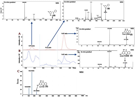 The obtained cell pellets were washed twice in sterile water to minimize contamination from the residues of the culture medium. Then, the pellets were initially disrupted by using freeze-thaw at −80 °C and 37 °C, followed by incubation in 20 mL of lysis buffer with pH 7.4, containing 20 mM sodium phosphate, 1% tween-20, and 1 mg/mL lysozyme in the ice bath for 1.5 h. The clear lysate was harvested by centrifugation at 4 °C (10,000 rpm) for 30 min. The obtained clear lysate was partitioned twice with an equal volume of EtOAc in a 250 mL Erlenmeyer flask at 25 °C and 300 rpm for 30 min, then centrifuged at 6000 rpm at 4 °C for 5 min to separate the organic layer. The EtOAc layer was transferred to a new tube and evaporated until dry under a gentle stream of N2 gas. The residues were dissolved in 150 μL of methanol (HPLC grade) before the detection of the intracellular 2,4,6-TriHB (5) and associated metabolites by using high-resolution LC-ESI-QTOF-MS/MS.