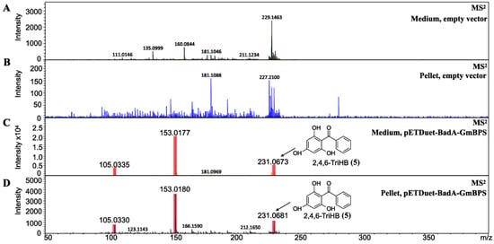 The identification of 2,4,6-TriHB (5) from the culture medium and pellets by using high-resolution LC-ESI (+)-QTOF-MS/MS (CID of 20 eV). (A) No MS/MS spectra of 2,4,6-TriHB (5) were detected from the medium extract of clones harboring pETDuet-1 empty vector (control). (B) No MS/MS spectra of 2,4,6-TriHB (5) was found in the pellet extract of clones harboring pETDuet-1 empty vector. (C) The MS/MS spectra of 2,4,6-TriHB (5) (red highlights) from the medium of clones harboring pETDuet-BadA-GmBPS. (D) The MS/MS spectra of 2,4,6-TriHB (5) (red highlights) from the pellet of clones carrying pETDuet-BadA-GmBPS.