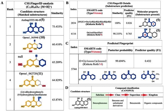 The raw mass data of 2,4,6-TriHB (5) showing m/z 229.0496 [M − H]− was also annotated by SIRIUS to obtain the most accurate and reliable prediction. Based on a high-resolution isotopic analysis, the molecular formula of the query subject was elucidated as C13H10O4 (99.916%), which was consistent with the exact formula of 2,4,6-TriHB (5) reported in several databases (Figure 7A). CSI:FingerID revealed that our query subject was best annotated as 2,4,6-TriHB (5) over the 100 molecular-structure candidates (Figure 7B). Several substructures belonging to 2,4,6-TriHB (5) were detected to be present, for example, the molecular fingerprint encoded by “c(:c(:c:c(:c:1)~[#8])~[#8]):c:1~[#8]” represented the B-ring system of 2,4,6-TriHB (5) (Figure 7C). The substructure corresponding to the B-ring system connected to the carbonyl group of benzoate (2) was also predicted to exist in the same candidate structure. CSI:FingerID showed the presence of molecular property corresponding to phloroglucinol in the trained structures with the posterior probability of 93.374% (F1 = 0.853) (Figure 7D). CANOPUS revealed that our query compound was classified as a benzophenone, and that benzene derivatives and benzenoids served as its molecular class ancestors (Figure 7E).