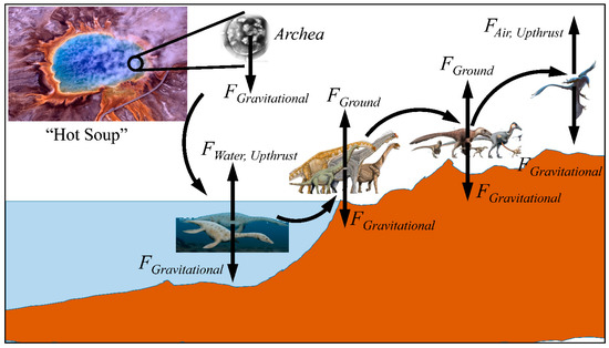A diagrammatic representation of the evolution on Earth and the force of gravity acting on all stages of evolving life. As organisms evolved from the primary microorganisms to the formation of life in water, the transition to land and then air was constantly under the effect of gravitational forces (Legend: the images of the “hot soup”, archaea and dinosaurs were obtained from https://en.wikipedia.org/wiki/Dinosaur, under the CC BY 2.0 license, Accessed on 3 October 2020).