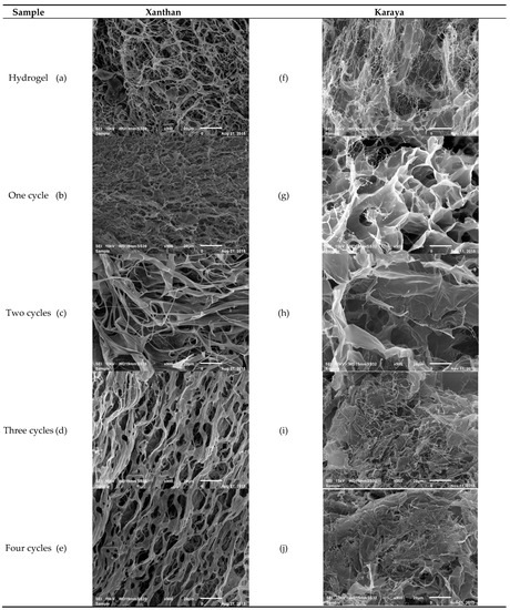 In the case of xanthan cryogels, the maximum level of structural order was reached with 3-cycles since after this number of events, the structural order decreases, indicating instability of the polymer chains (Table 1). Giannouli and Morris [13] and Nur Hazirah et al. [16] explain that this phenomenon occurs because the ramifications of the xanthan chains bend or protrude at right angles of the main chain, which disorganizes the gel network; consequently, the structural order decreases.