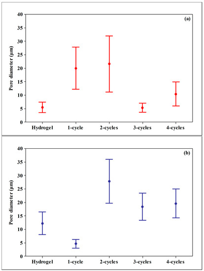 At the third cycle, the structure of the xanthan cryogel was not modified significantly (p > 0.05), which may be due to the formation of larger molecular assemblies, mainly of union or dimerization crisscrossed (formation of a double coaxial helix), which promoted the rearrangement of the polymeric chains reaching their highest degree of conformational ordering. Thus, more homogeneous pores were observed (Figure 3a).