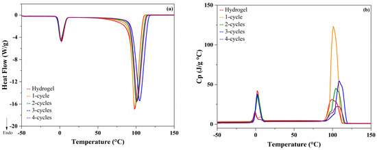 However, the changes in the Cp values during melting (Figure 5b), indicated significant differences (p < 0.05), mainly in the karaya cryogels of 1 and 4-cycles. In these samples, the Cp values were lower; consequently, there were no significant changes at the structural level in comparison to xanthan cryogels. In the case of the evaporation zone, more noticeable changes in the heat flow were observed. A displacement in the Te value as a function of the number of freeze–thaw cycles was observed; consequently, it was confirmed that there are structural changes such as kinetics [15].