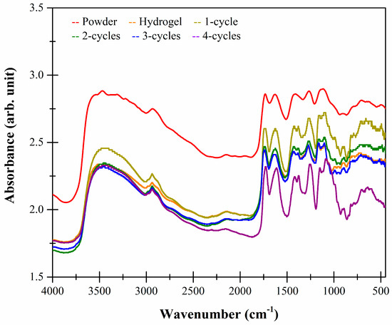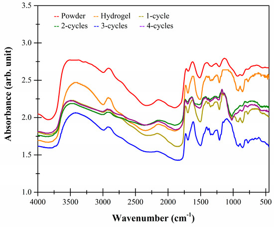 At 1725 cm−1, there were stretching vibrations of the C=O groups of aldehydes and free acetyl groups. The band at 1630 cm−1 indicates stretches of the C=O of methylated ester groups of galacturonic acid. These two bands (1725 and 1630 cm−1) are characteristic of the karaya gum, which have greater intensity in the 4-cycle cryogel, indicating that the cryogel formation process favors the formation of this type of interaction. Finally, at 1270 cm−1, there were asymmetric stretches of C–O–C of aromatic ethers, characteristic of this type of polysaccharide. Lastly, at 1100 cm−1, there were stretches of the OH− groups of the secondary alcohols and asymmetric stretching of the pyranose rings [23,24].