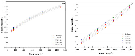 In the case of karaya cryogels (Figure 9b), all behaved as a shear thickener fluid, which characterizes this type of material with an increase in viscosity as the shear rate increases, favoring the molecules having a high degree of collisions and, therefore, greater contact between them. This is corroborated with the values obtained from the flow behavior index n, where these are greater than 1 [4,28].