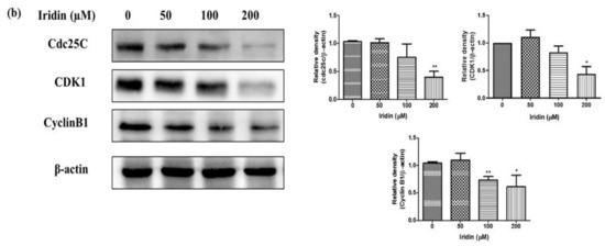 2.2. Iridin Induces G2/M Phase Cell Cycle Arrest by Modulating Cyclin B1, Cdc25C, and CDK1 Protein Expression in AGS Cells