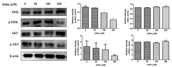 2.5. Effect of Iridin on PI3K/AKT Signaling Pathway in AGS Cells