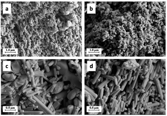 SEM pictures of CaP (a,c) and CaP–HS (b,d) at 50,000× magnification on the top (a,b) and 100,000× magnification on the bottom (c,d).