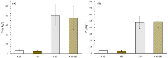 Considering the effect on Mg, the treatment with CaP–HS was weakly significant (p = 0.037). The only difference respect to the control was a slight decrease recorded for CaP treatment (Figure S3).