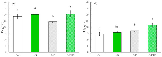 Concentration of Ca (A) and P (B) in root of Diplotaxis tenuifolia. Data are mean ± standard deviation (n = 4). When the interaction between experimental factors (CaP × HS) was significant at ANOVA, different letters were used to indicate statistically significant differences between treatments at Tukey’s post-hoc test (p ≤ 0.05).