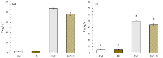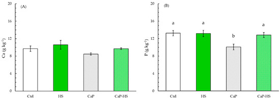 As for Ca level, instead, CaP and HS were equally significant (p < 0.01) (Figure 8A). CaP addition to nutritive substrate decreased Ca content in leaves with respect to the other treatments. On the contrary, the presence of HS, both alone and in CaP–HS, showed an increase in Ca concentration if compared with the two treatments without HS.