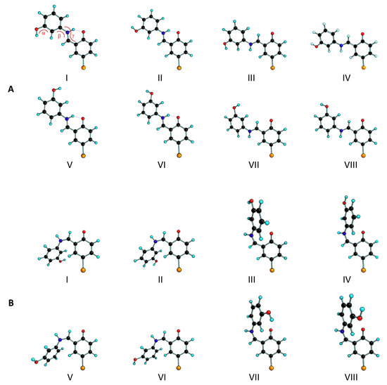 The four most stable conformers of the E-enol-imine isomer (conformers I, II, V and VI) are more than 38 kJ mol−1 lower in energy than the next conformer in the increasing order of energy (conformer XV). These conformers exhibit an intramolecular hydrogen-bond interaction of the O–H···N type (see Figure 2), which leads to the formation of a nearly planar pseudoaromatic six-membered ring where the dihedral angles ϒ and δ are both ~0°, and that is responsible for their stabilization [47]. Within the two pairs of conformers (I, II) and (V, VI), the main structural difference is the orientation of the non-hydrogen bonded phenolic OH group (the α dihedral angle being near 0 or 180°), while the orientation of the two aromatic rings is the same (i.e., the dihedrals β and ϒ are similar in each pair of conformers). The two pairs differ essentially in the value of the dihedral angle β, which is ca. 37° in I and II and about −144° in V and VI. Note that in all the low-energy intramolecularly H-bonded E-enol-imine conformers the bromo-substituted phenolic ring is roughly planar with the azomethine moiety (ϒ is ~0°) due to the involvement of these two molecular fragments in the hydrogen bond, while the non-substituted phenol ring deviates considerably from the plane formed by the bromo-substituted phenolic ring and azomethine group, mostly because of the repulsive interaction between the azomethine hydrogen atom and the closest located hydrogen atom of the unsubstituted phenolic moiety (see Figure 2).