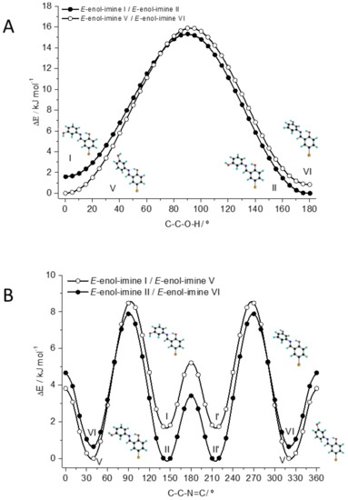 It is also worth mentioning that, in a matrix isolation experiment, higher-energy conformers may convert into lower energy forms during deposition (conformational cooling effect), if the energy barriers separating the conformers are small enough (a few kJ mol−1) [33,34,53,54,55,56]. In addition, moderate size barriers (up to ca. 20–25 kJ mol−1) associated with transformations involving only movement of a hydrogen atom may also allow conformational decay by quantum mechanical tunneling through the barrier, this phenomenon being common for molecules bearing the hydroxyl moiety, in particular for phenols and naphtols and for carboxylic acids [57,58,59,60,61,62]. In order to estimate the energy barriers separating the low-energy conformers of BHAP, relaxed potential energy scans were performed (at the B3LYP/6-311++G(d,p) level) along the relevant coordinates. In the studied molecule, the four low-energy E-enol-imine conformers (I, II, V and VI) can be interconverted by two ways: (i) by rotation of the phenolic OH around the C–O bond; and (ii) by rotation of the whole phenol group around the C–N bond connecting to phenol and azomethine fragments. The corresponding potential energy scan profiles are shown in Figure 5.