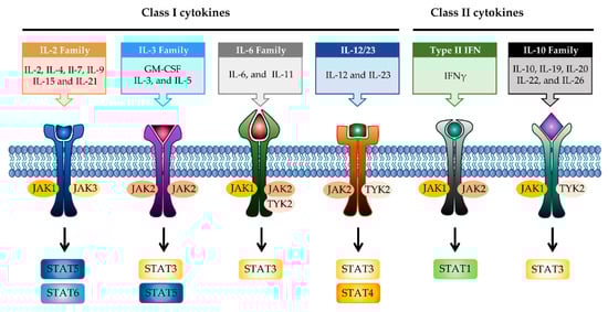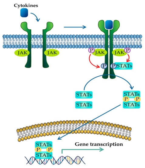 - Morris, R.; Kershaw, N.J.; Babon, J.J. The molecular details of cytokine signaling via the jak/stat pathway. Protein Sci. Publ. Protein Soc. 2018, 27, 1984–2009. [Google Scholar]