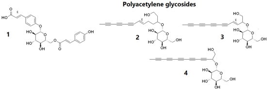 Chemical structure of compounds, 2-Propenoic acid, 3-[4-[[6-O-[(2E)-3-(4-hydroxyphenyl)-1-oxo-2-propenyl]-β-d-glucopyranosyl]oxy]phenyl] (1), β-d-Glucopyranoside, (4E)-1-(2-hydroxyethyl)-4-dodecene-6,8,10-triynyl (2), β-d-Glucopyranoside, (2E)-1-(hydroxymethyl)-2-dodecene-4,6,8,10-tetraynyl (3), β-d-Glucopyranoside, 1-(hydroxymethyl)-2,4,6,8,10-dodecapentaynyl (4) isolated from BF4 of Bidens pilosa.