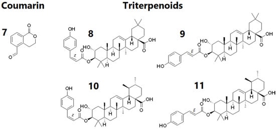 Five compounds were isolated and identified from FF1 (Figure 3), a coumarin, erythrocentaurin (7), as well as four isomeric triterpenoids, cis-p-coumaroyloxy maslinic acid (8), trans-p-coumaroyloxy maslinic acid (9), cis-p-coumaroyloxy corosolic acid (10) and trans-p-coumaroyloxy corosolic acid or jacoumaric acid (11). The cis and trans isomers p-coumaroyloxy corosolic and maslinic acids were isolated as mixtures eluting closely together as they share the same molecular formula and only differ in the position of a methyl group.