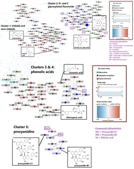 Cluster 1 grouped features from all three species (pie charts containing green, blue and red portions), although specific nodes were observed for F. berteroana within the cluster (fully red pie charts) while B. pilosa and F. berteroana shared several similar features (green and red pie charts). The annotated features were iridoids such as loganic acid and isomers m/z 375.1301 [M − H]−, as well as seco-iridoid swertiamarin m/z 419.1197 [M + HCOO]− from F. berteroana extracts and fractions. This is the first time these specific compounds are observed in F. berteroana, although boonein, also an iridoid, was found in the fruits [8] and swertiamarin was previously isolated from Fagraea fragrans [38]. Furthermore, several iridoids and iridoid glycosides have been isolated from the Fagraea genus [38,39,40,41,42,43]. Although non-significant, most features in this cluster had positive correlations to cell proliferation as observed by the pink/red node borders. This observation suggested that iridoids, may also contribute to the proliferation of dermal papilla cells. Swertiamarin is found in a tonic that has shown a significant increase in hair density for patients suffering from premature alopecia, although the hair regrowth was mainly attributed to oleanolic acid [44].
