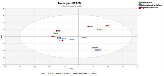 The extracts and fractions were first analyzed by PCA to observe global trends according to species in Figure 5. These consisted of the ethyl acetate extract of B. pilosa (BEAE) and its most polar fractions BF3 and BF4, the ethanol/water (CEWE) and ethyl acetate (CEAE) extracts of C. inophyllum with fractions CF3, CF4 and CF5, and finally the ethyl acetate (FEAE) extracts of F. berteroana with fractions of increasing polarity FF1, FF2, FF3 and FF4.