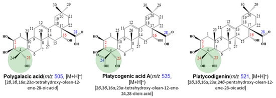 Three types of aglycone groups (polygalacic acid, platycogenic acid A, platycodigenin).