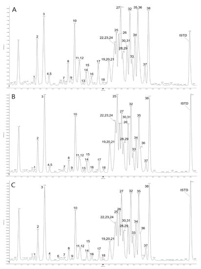 UPLC chromatograms of 38 saponins from Platycodon grandiflorum. (A) roots (containing peel), (B) roots (without peel), and (C) blanched roots (without peel).