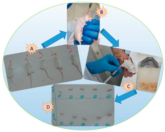 Photograph showing an albino rat for plant extract testing (A,B), the sub-plantar injection of carrageenan into the left posterior paw of a mouse (C), and the left and right hind legs cut at joint height (D) (all, original photos).