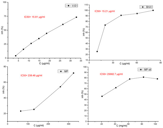 In fact, based on the values of IC50 (Figure 2), the antioxidant activity in M. pulegium was lower compared to previous findings (17.92–25.66 µg/mL) [34,35]. The difference between our results and the others reported in literature may be attributed to the differences in chemical compositions, which depend on the areas of the plant collection, plant parts used and the extraction method, as acknowledged in a recent publication [36]. Despite these differences, the antioxidant activity of the M. pulegium oil and extract remains higher than activities of Mentha rotundifolia and Mentha villosa. The high antioxidant activity found for both extract and essential oil are critical and determinant for their therapeutic value and this may be in part responsible for their reputation as anti-inflammatory, hypotensive, hypoglycemic, and depurative agents.