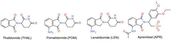 After thalidomide (THAL) was reinstated in therapy, first as a treatment for erythema nodosum leprosum, later for multiple myeloma, the interest in thalidomide derivatives significantly increased [23]. This resulted in the approval of two structurally similar derivatives, namely pomalidomide (POM) and lenalidomide (LEN) as well as apremilast (APR), the structure of which shows a larger difference (Figure 1).