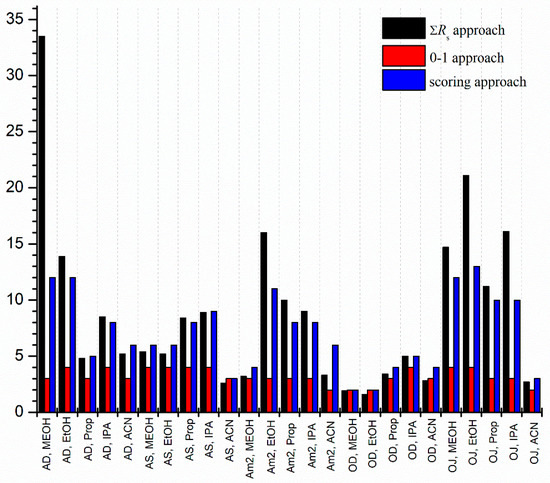 Chromatographic parameters such as retention time of the first (t1) and second eluting enantiomer (t2), resolution (Rs) and elution sequence are summarized in Table 1 for all the applied systems using constant 0.5 mL/min flow rate and 20 °C column temperature. Some representative chromatograms are depicted in Supplementary Figure S1. It can be seen that there are several cases where baseline separation can be achieved for the analytes and in many cases extremely high Rs (Rs > 10) values were also obtained. The results indicate that polysaccharide-type CSPs under polar organic conditions are highly versatile for the enantioseparation of THAL class of drugs. There are two approaches, often applied to compare the separation capacity of applied chromatographic systems. In the first one, the sum of the Rs values is calculated; however, in our case, this approach would distort comparison due to the extremely high resolutions obtained on the Chiralpak AD column. Moreover, it should be noted that high Rs values were accompanied with long analysis times, which is detrimental in practice. The other approach is to use 0 or 1 values depending on whether the separation is successful (enantiorecognition observed) or not. This approach, however, overestimates the separation with low resolutions. To characterize the enantioseparation capacity of our applied systems, a special scoring strategy was used. According to the Rs value of each individual run, a score from 0 to 4 was given, based on the performance of the separation system (Rs = 0 = 0, 0 < Rs < 1.5 = 1, 1.5 < Rs < 2.5 = 2, 2.5 < Rs < 4 = 3, 4 < Rs = 4) and the sum of score values for all four drugs were calculated in each applied separation systems. The comparison of enantioseparation systems with all three approaches is illustrated in Figure 3 and Supplementary Figure S2.