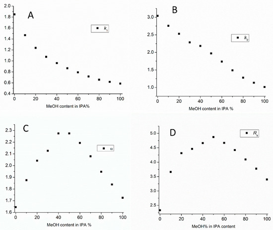 Plots of the retention factors ((A): k1, (B): k2), selectivity (C), and resolution factors (D) as a function of the MeOH content in IPA on Chiralcel OD column. (Chromatographic conditions: flow rate, 0.5 mL/min, column temperature 20 °C).