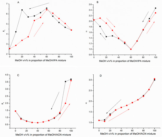2.3. Enantioseparation of Mobile Phase Mixtures. Hysteresis of Retention and Selectivity