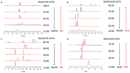 Chromatograms observed in different eluent compositions during the hysteresis study. (A): Enantioseparation of POM in different MeOH/IPA eluent mixtures using Chiralpak AD, (B): Enantioseparation of THAL in different MeOH/ACN eluent mixtures using Chiralpak AD, (C): Enantioseparation of THAL in different MeOH/IPA eluent mixtures using Chiralpak AD (D): Enantioseparation of THAL in different EtOH/ACN eluent mixtures using Chiralpak AD.