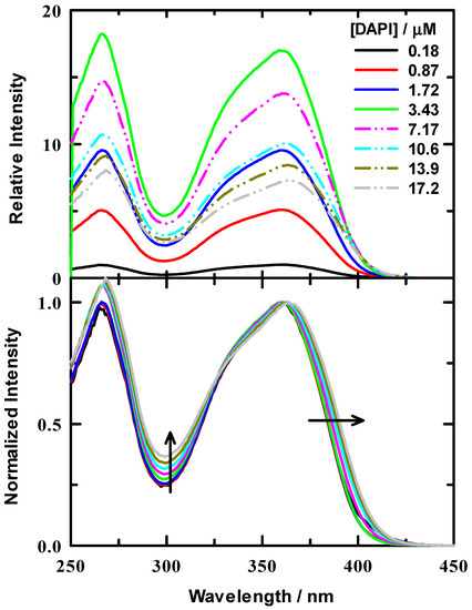 Excitation spectra for DAPI/DNA titration in 10 mM tris buffer at pH = 7.0. DNA concentration was 1.25 μM. Upper panel: Relative intensities of example spectra for varied ratios that are all scaled relative to DAPI/tris buffer. The DAPI/buffer was normalized to 1. Lower panel: normalized spectra for all ratios to help visualize the relative spectral changes. Arrows indicate the direction of spectral change with increasing ratio.