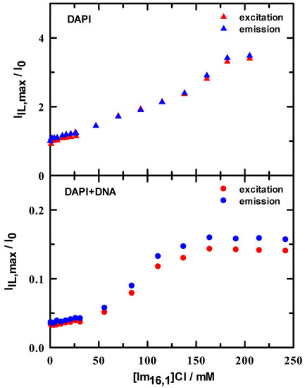 Spectral intensity ratios in 10 mM tris buffer at pH = 7.0 as a function of added IL determined by ratioing intensity in the presence of IL to that in the absence of IL. Upper panel: DAPI excitation (▲) and emission (▲) ratios. Lower panel: DAPI + DNA duplex excitation (●) and emission (●) ratios.