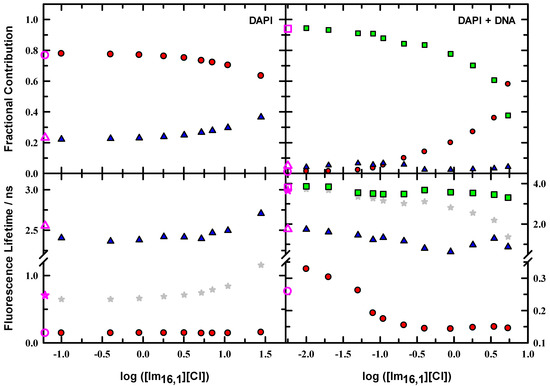 While the steady-state spectroscopy provides a general characterization of the DAPI fluorescence characteristics, time-resolved fluorescence reveals further details of the emissive properties and compiles the details of magic-angle intensity decay measurements for DAPI and DAPI + DNA duplex solutions in the presence of IL; Figure 6 illustrates the variations as IL is added to solution. These data are presented using a logarithmic scale to show the parameter variation more clearly, particularly at low IL concentration. Filled symbols show the data for time constants and associated fractional contributions to the intensity decay for solutions that include IL, and open pink symbols show the corresponding data in the absence of IL for comparison. Fractions were calculated from the raw data as