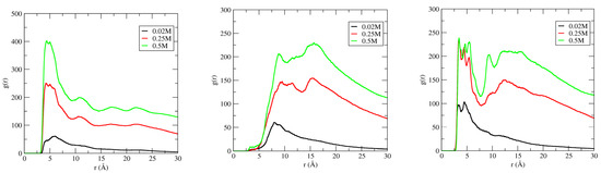 Owing to the perpendicular orientation of [Im16,1]+ to the DNA duplex groove bases, the IL alkyl chains on the opposite face of the imidazolium are exposed to the bulk solution and parallel alkyl group alignment of the cations to each other implies the existence of alkyl–alkyl chain interactions. The imidazolium ring COM RDFs around the DNA duplex were modified by multiplying the RDF at each concentration by the average number density of particles in the system, with the goal of determining the effect of concentration on the binding characteristics of IL–DNA duplex. Figure 9 shows the concentration dependent results for the imidazolium ring COM distribution around the DNA duplex phosphate backbone (left panel), major groove (middle panel), and minor groove (right panel) for 20 mM, 250 mM, and 500 mM solutions.