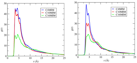 RDFs of the center-of-mass around minor grooves of DNA duplex in 20 mM IL solutions. The electronegative sites N3 and O2 atoms for the minor groove were used for these RDF calculations. (Left panel): Data for the imidazolium ring–groove interactions. (Right panel): Data for tail–groove interactions.
