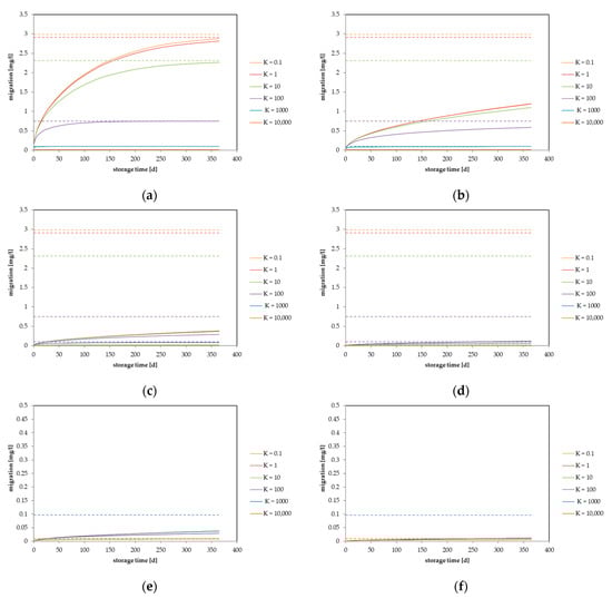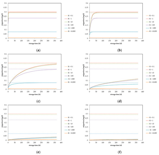Calculated migration into food considering different partition coefficients: (a) diffusion coefficient DP = 1 × 10−10 cm2/s, (b) DP = 1 × 10−11 cm2/s, (c) DP = 1 × 10−12 cm2/s, (d) DP = 1 × 10−13 cm2/s, (e) DP = 1 × 10−14 cm2/s and (f) DP = 1 × 10−15 cm2/s. Calculated for a layer thickness of d = 50 µm, cP,0 = 100 mg/kg, V = 1000 mL, A = 600 cm2.