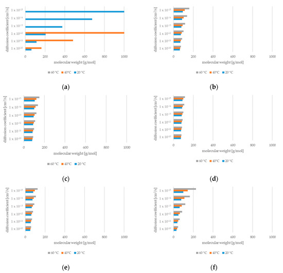 Diffusion coefficients at 20 °C, 40 °C, and 60 °C in different polymers: (a) PP, (b) GPPS, (c) HIPS, (d) ABS, (e) SAN, and (f) PET (without bars: molecular weight > 1000 mg/mol).