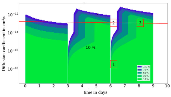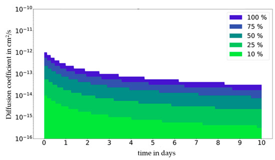 The impact of the partition coefficients can be summarized using a so-called migration map (Figure 4). The migration map is generated by calculating the migration in a diffusion coefficient range from 10−10 cm2/s to 10−16 cm2/s and in a time range between 0 and 10 days (single use) independently of a partition coefficient range from K = 0.1 to K = 10,000. The migration map visualizes the influence of the partition coefficient on the migration results. As a quantitative criterion, we suggest considering the partition coefficients in migration modelling when the migration values are above 10% of the migration at equilibrium. Such a 10% criterion is supported by the fact that analytical approaches are also typically associated with a measuring uncertainty in the range of 10%. Therefore, this percentage seems to be a suitable indicator as to whether the dependence of the migration from partitioning is significant or not. In the case the migration variation being dependent on the partition coefficient being less than 10%, it is considered that the impact of partitioning on migration is of low significance. A migration variation in this range would not be accessible by experimentation due to the uncertainty usually being in the range of 10% during migration measurements. If the migration range resulting from different K values has a maximum migration value that is no more 10% higher than the minimum migration value, then the point is colored in light green. For single-use applications, the smallest partition coefficient K = 0.1 provides the highest migration result, which is therefore the basis for the migration map. If the influence is higher than 10%, the color changes to dark green at 25%, bluish green at 50%, violet at 75%, blue at 100%, and white at >100%.