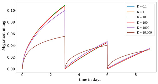 In summary, the impact of partitioning is high immediately after the food has been exchnaged and lowers over time until the next repeated-use occurs. In detail, after 8 days (= 192 h = 2 × 3 days + 2 days) at a diffusion coefficient of 10−13 cm2/s (position 3 in Figure 5), the two migration curves for K = 0.1 and K = 10,000 cross each other and stay close to each other throughout the remaining time of the contact period. Immediately after the exchange of the food, the migration for a high partition coefficient is higher compared to migration at a low partition coefficient, becomes equal, and exceeds it at a later time point.