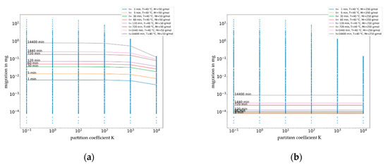 Plot of migration (m) in mg for a generic migrant of molecular weight of 50 g/mol (a) and 250 g/mol (b) from a PET layer against partition coefficient (KP,F) at 40 °C in dependence of time.
