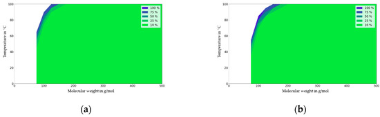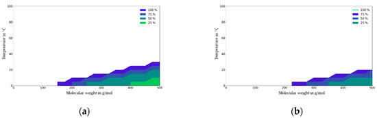 Migration map for PP for contact times of 6 h (a) and 1 day (b). Molecular weight in g/mol against temperature (T) in °C. Deviation of migration in mg/dm2 independent of partition coefficient (KP,F) expressed in % at a given initial concentration (1000 mg/kg), material thickness (2000 µm), and area to volume ration (6 dm2 per kg food).