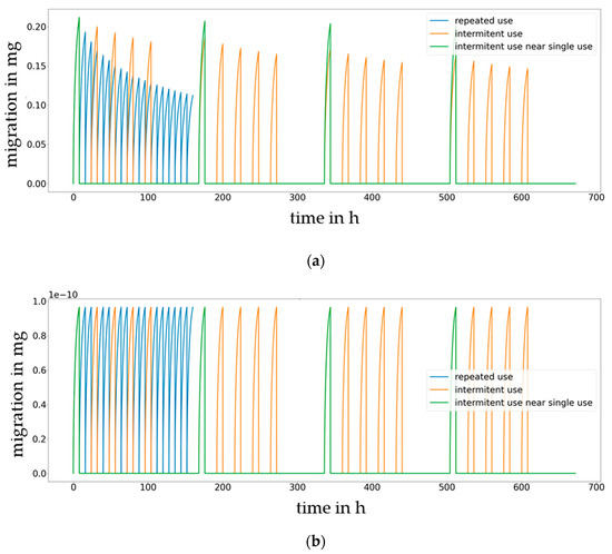 Comparison of repeated-use scenarios (blue: continuous use, orange: intermittent use 8 h contact and 16 h without contact and green: occasionally use). Migration of Metilox (a) and Irganox 1076 (b) to 50% ethanol (K = 10) at 60 °C.