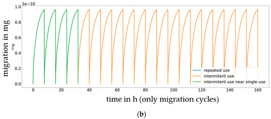 Cumulated migration of Metilox (a) and Irganox 1076 (b) to 50% ethanol at 60 °C by eliminating no-contact times (only migration cycles displayed, blue: continuous use, orange: intermittent use with 8 h contact and 16 h without contact and green: occasionally use).