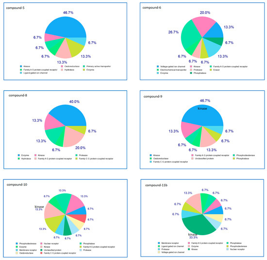 Compounds were scanned using Swiss Target Prediction software which showed promising affinity for kinases, in particular FLT3 kinase. The highest percentage 46.7% was recorded by compounds 5 and 9 while compound 11 expressed 33.3% kinase affinity. Moreover, compounds 6 and 10 showed kinase affinity equivalent to 20 and 13.3%, respectively, Figure 2.
