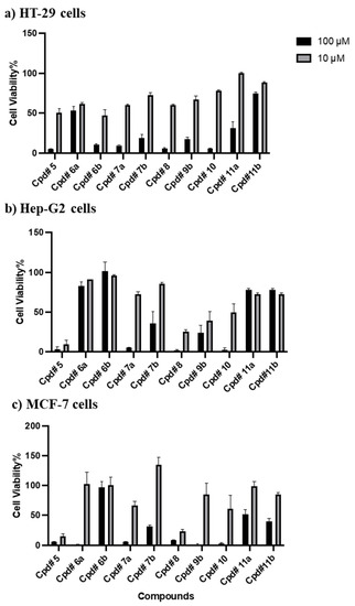Effect of synthesized compounds on the viability of HT-29 (a), HepG-2 (b), and MCF-7 (c). Cells were treated with 10 µM and 100 µM for 72 h and viability was determined using MTT assay. Data are expressed as mean ± SD; n = 3.