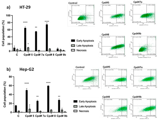 Apoptosis/necrosis assessment in HT-29 (a) and HepG-2 (b) cells after exposure to the synthesized compounds. Cells were exposed to predetermined IC50 of compounds 5, 7a, 8, and 9b for 24 h and were stained with annexin V-FITC/PI. Cell populations were plotted as percentage of total events. Data is presented as mean ± SD; n = 3. * Significantly different from the control group at p < 0.05. ** Significantly different from the control group at p < 0.005 **** Significantly different from the control group at p < 0.0001.