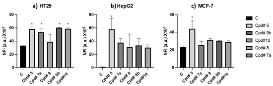 Autophagic cell death assessment in HT-29 (a) HepG-2 (b) and MCF-7 (c). Cells after exposure to compounds 5, 7a, 8, 9b, and 10 for 24 h. Cells were stained with acridine orange staining. Net fluorescent intensity (NFI) was counted and compared to the basal fluorescence of the control group. Data are presented as mean ± SD; n = 3. * significantly different from the untreated cells.