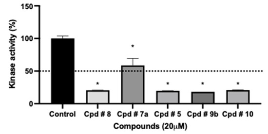 The initial screening was performed to determine the preliminary kinase inhibition activity of the synthesized compounds. screened compounds showed inhibition activity at the testing dose (20 μM) ranging from 41.4% to 81.8%. Like what was predicted in kinase affinity, compounds 5, 8, 9b, and 10 recorded significant activity with % kinase enzyme inhibition ranging from 79.4% to 81.8%, Figure 7. Compound 7a showed mild kinase inhibition of 41.4%. Observed agreement between kinase inhibition and antiproliferative activity can be further assessed to identify the potential inhibitors of oncogenic receptors including FLT3 receptor. However, similar to our findings, previous studies reported that compounds bearing the thieno[2,3-d]pyrimidines scaffold exhibited inhibitory activity against kinases [31,37].